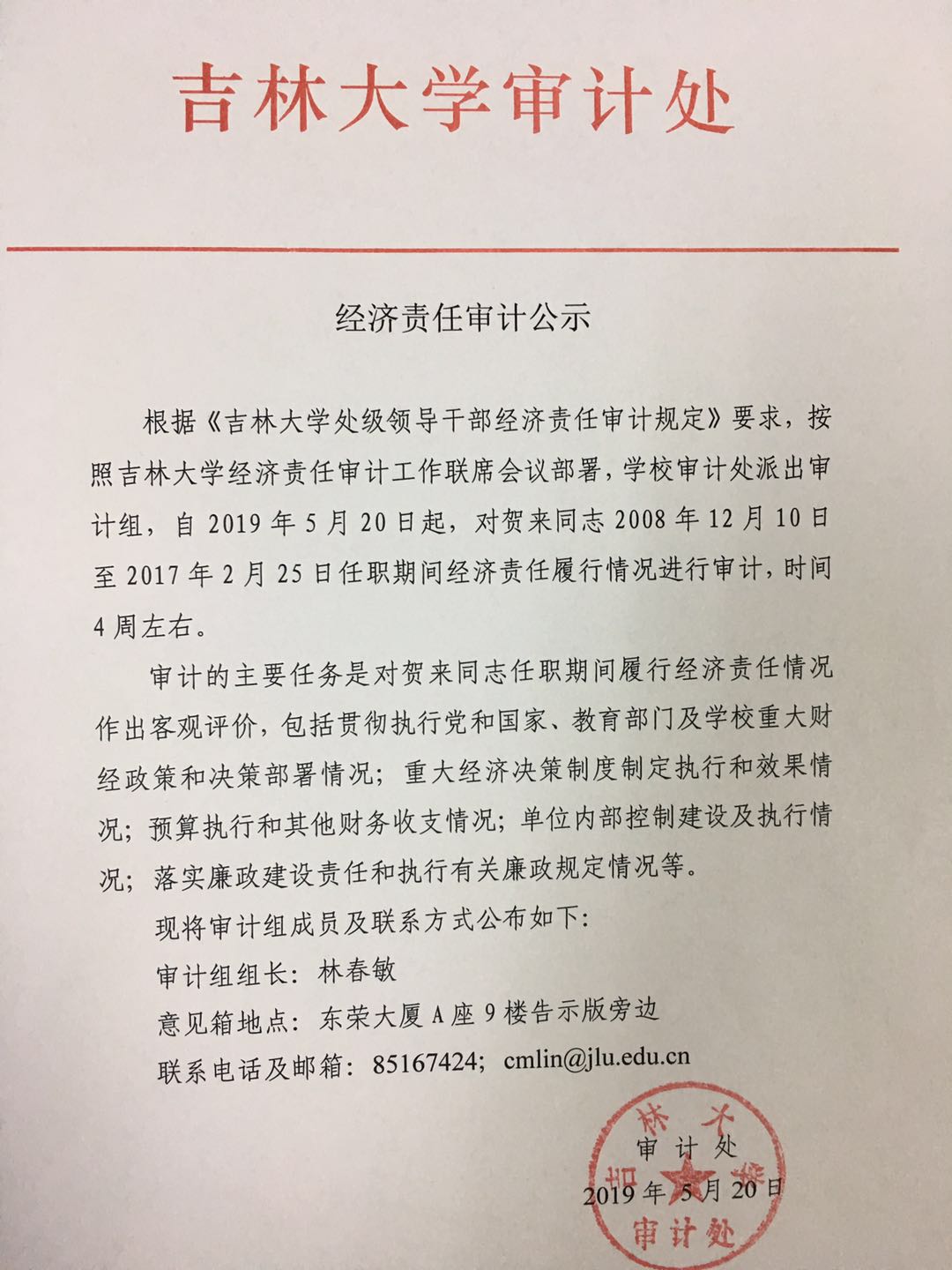 关于对贺来经济责任审计的公示