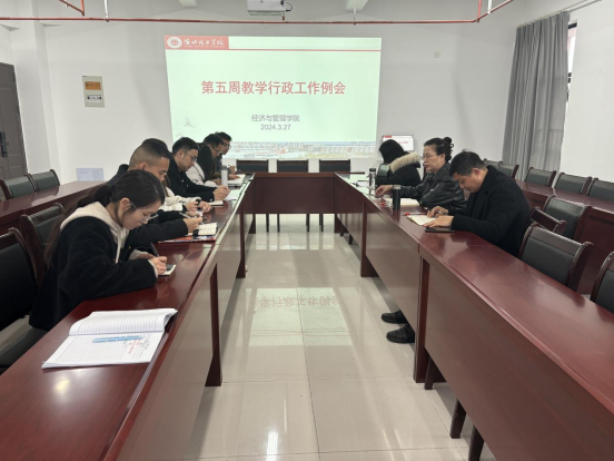 2024年3月27日,经济管理学院在行政楼725召开第五周教学行政会议,会议由吴玲院长主持,副院长秦品德、院长助理张珊、实训中心主任及各教研室主任参加会议。