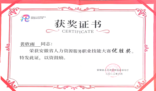近日,2023年安徽省人力资源服务职业技能暨创新创业大赛省级赛在合肥人力资源服务产业园成功举行,经过大赛初赛、复赛、决赛三个环节,经济管理与建筑工程学院李健老师和裴欣雨同学在省内众多选手当中脱颖而出,荣获大赛优胜奖。