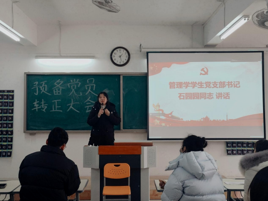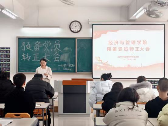 2024年1月9日,best365手机版官网学生支部在二教323教室召开预备党员转正大会。书记助理叶赵强、组织员王胜男、经济学学生党支部书记员禹辛、管理学学生党支部书记石园园以及全体学生党员参加本次会议,会议由丁阳主持。