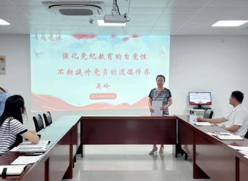 紧接着,吴玲书记开展了一场以“强化党纪教育的自觉性,不断提升党员的道德修养”为主题的专题党课。党课上,吴玲书记从三个方面深入阐述了党纪教育的意义和实践路径。首先,强调了认清本次活动的重要性,明确了党纪教育在提升党员素质、增强党的凝聚力和战斗力方面的关键作用。其次,提倡党员们认真接受党纪教育,不断提升个人党性修养和能力,通过学习增强政治意识,明确道德标准。最后,吴玲书记对党员们提出了“学、思、做”的实践路径,鼓励党员们不仅要学习原文,更要深入思考,将学习成果转化为实际行动。