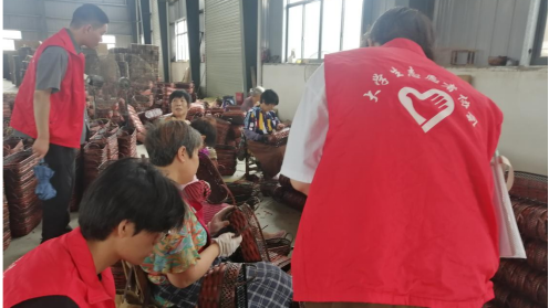 随后,团队深入“安徽紫亿工艺品有限公司”与“阜南县金源柳编工艺品有限公司”等企业的生产一线,在这里,队员们见证了柳编生产的各个环节并亲身体验了简单的柳编手法。团队成员感受到了黄岗柳编是以多样的手工技法及柳编独特的材料属性,跻身于世界工艺美术之林。团队成员还与企业负责人进行了深入的交流,了解了企业在生产过程中遇到的困难和挑战。