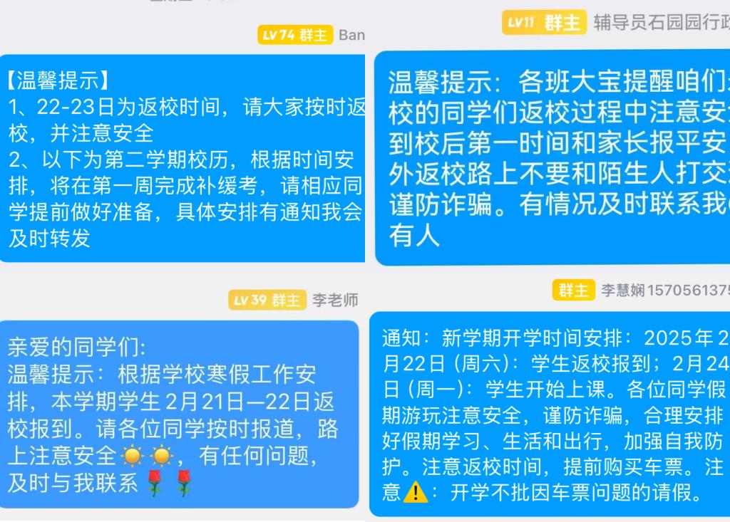 全体辅导员“全覆盖”收集学生返程车次、到校时间,了解不能按时返校学生的情况和原因,重点关心关注偏远地区学生、购票困难学生返校问题,推送“返程安全温馨提示”,涵盖防诈骗、极端天气应对、交通安全等内容,以确保学生安全顺利返校。