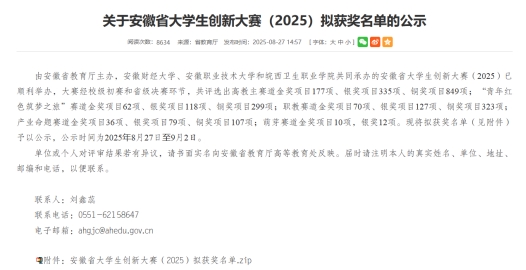 日前由安徽省教育厅主办、安徽财经大学等单位联合承办的安徽省大学生创新大赛(2025)圆满落幕。best365官网经济管理学院学子不负众望,在产业赛道、高教主赛道及红旅的激烈角逐中崭露头角,最终斩获1 项省级银奖、3 项省级铜奖。