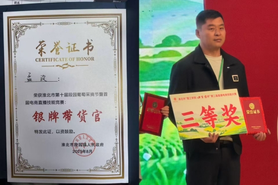 在这场校地协同实践中,各方皆获成长:大庄村孟波、许雷、潘创等村委从“零基础”实现独立写脚本、拍素材、运营账号的蜕变,孟波更是取得淮北市第十届段园葡萄采摘节电商直播大赛二等奖、段园葡萄年度推广大使称号、淮北理工学院直播大赛三等奖;学生团队将市场营销、新媒体运营专业知识转化为实操能力,在素材拍摄、内容策划、技能培训中锤炼了解决实际问题的能力;雷旭老师也在项目推进中深化了产教融合教学思路,实现教学与实践的双向赋能。