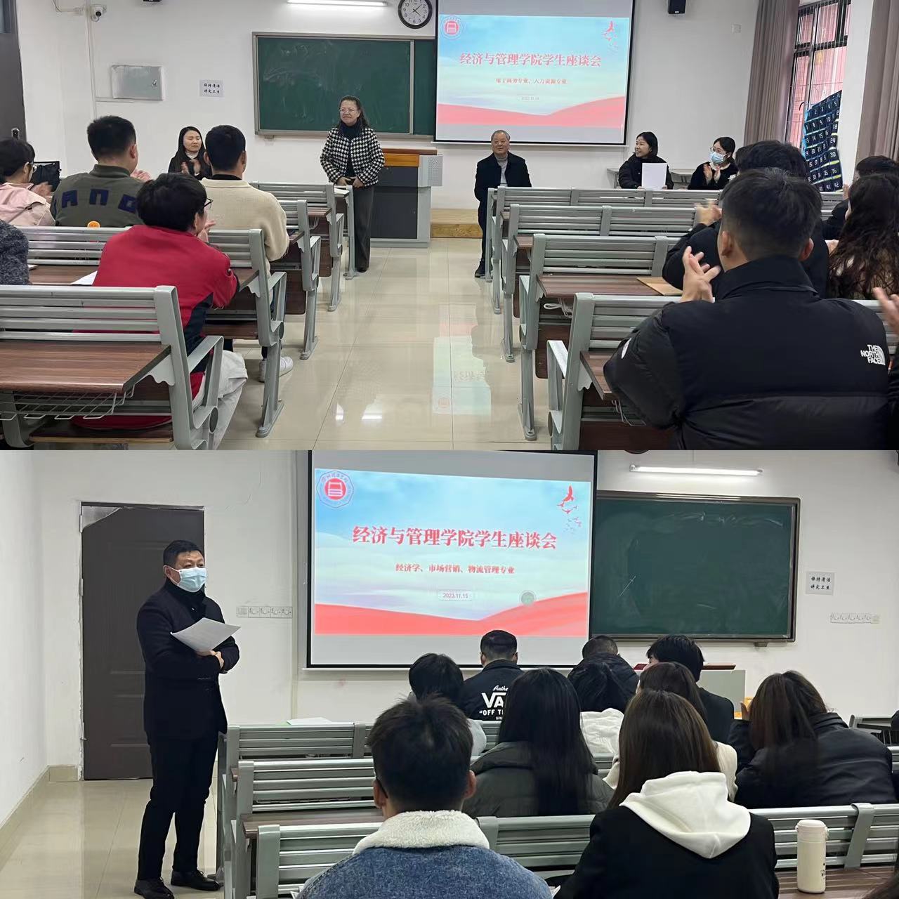 2023年11月15日下午,根据学院的计划,经济与管理学院如期召开了期中学生座谈会。座谈会根据不同专业划分为两个会场,参会人员包括党委副书记、副校长汪建利、best365手机版官网院长吴玲、各教研室主任,以及学院各级各班的班长和学习委员。会议由院长助理张珊和秦品德分别主持。