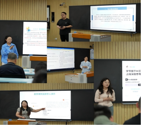 活动分为两个环节,第一个环节是各教研室主任汇报AI赋能教学的活动开展情况。五个教研室主任分别介绍了本活动从学期开始以后,进行了全覆盖动员学习、通过专题会议解读AI对教学的意义,激发教师积极性;全员参与初赛严格选拔,评估教学方案和AI应用,推选优秀教师进入决赛。