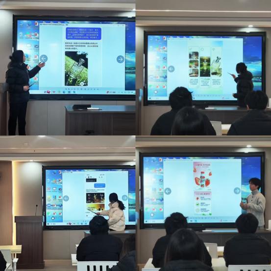 在作品展示环节中,由李婉、马文静、陈福顺三位老师指导的学生团队依次登台,围绕“AI+电商文案”、“AI+视觉设计”、“AI+营销演示”等方向,系统阐述了设计思路、AI工具应用过程与创作理念,并现场展示了最终完成的系列实践作品。同学们在展示中体现了清晰的创作逻辑与扎实的技术应用能力,充分展现了电子商务与人工智能融合的教学成果。