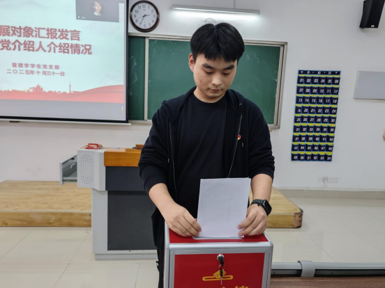 为进一步优化党员队伍结构,激发组织活力,扎实推进党员发展工作,根据发展党员工作计划,经上级党委预审同意,best365手机版官网管理学学生党支部于2025年10月31日在二教509召开接收预备党员支部大会,教工支部书记、党总支督导员刘路路老师,管理学学生支部书记石园园、徐瑞鲜老师,全体管理学学生党员及本批3位发展对象参加,会议由支部委员会成员王艺桐主持。本次会议采用线上与线下相结合的方式同步进行。