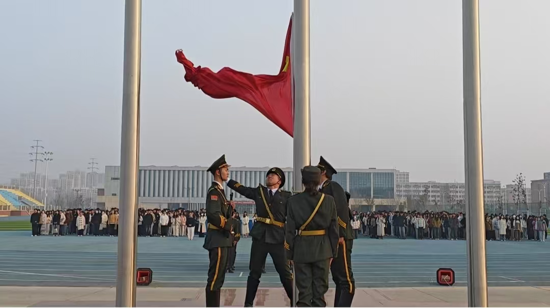 每周一的清晨,国旗护卫队的队员们步伐坚定、精神饱满,护送着鲜艳的五星红旗缓缓走向升旗台。随着激昂的《义勇军进行曲》响起,五星红旗冉冉升起,在晨光中迎风飘扬,点燃了全体师生的爱国情怀,也激发了大家对新学期的奋斗期待。