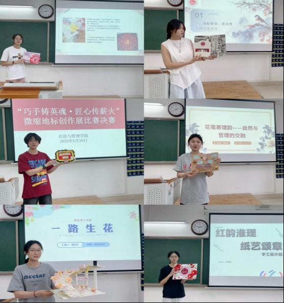 决赛于5月29日下午2:30在二教508举行,晋级选手围绕初赛作品,进一步打磨设计方案,并精心制作了PPT。PPT内容详实丰富,从设计红色地标的灵感来源、匠心独运的制作过程,到别具一格的设计亮点,再到深厚的文化价值,均进行了全面阐述。同时,搭配精美的图片、生动的视频以及灵动的动画,将作品中校园地标与红色元素融合的深刻内涵展现得淋漓尽致。经过激烈的比拼,最终评选出一等奖一名,二等奖两名,三等奖三名。比赛结束后,优秀作品进行线下展览,进一步强化学生对校园文化的认同感。