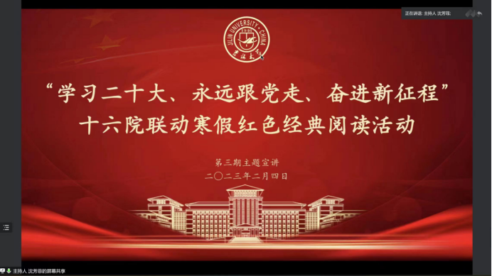 2023年2月4日晚六点,寒假红色经典阅读第三期如期举行。来自商学与管理学院、化学学院、考古学院、护理学院、马克思主义学院的五位主讲同学分别讲述了自己的读书心得。本次读书会由来自英国上市公司官网365的沈芳菲同学主持。