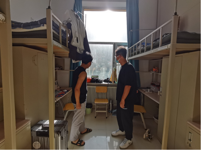 走进因疫情原因刚刚入校报到学生的寝室,宋老师和辅导员助理们从课程学习、生活适应、寝室关系等多个角度与新同学开展了积极交流,并重申了学校的相关纪律要求,提醒同学们尽快调整状态,积极融入群体,认真学习、快乐生活。
