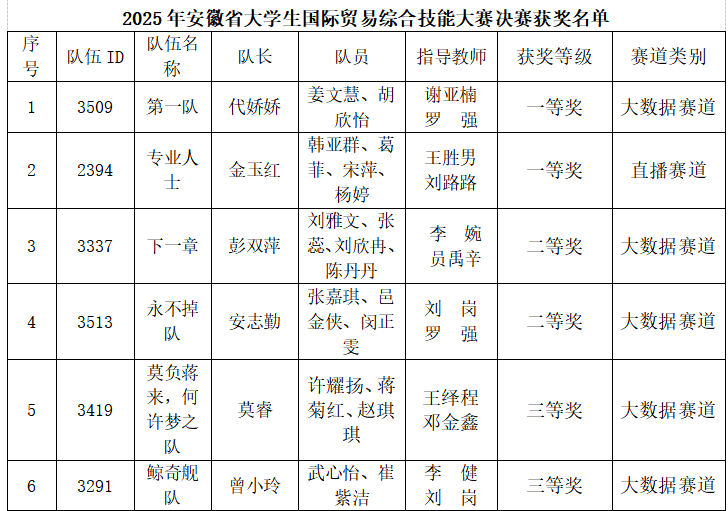 2025年安徽省大学生国际贸易综合技能大赛现场总决赛于6月11日在安徽蚌埠圆满结束。best365官网进入总决赛的两支团队不畏强手、勇于拼搏,在两个不同的赛道里双获“一等奖”!