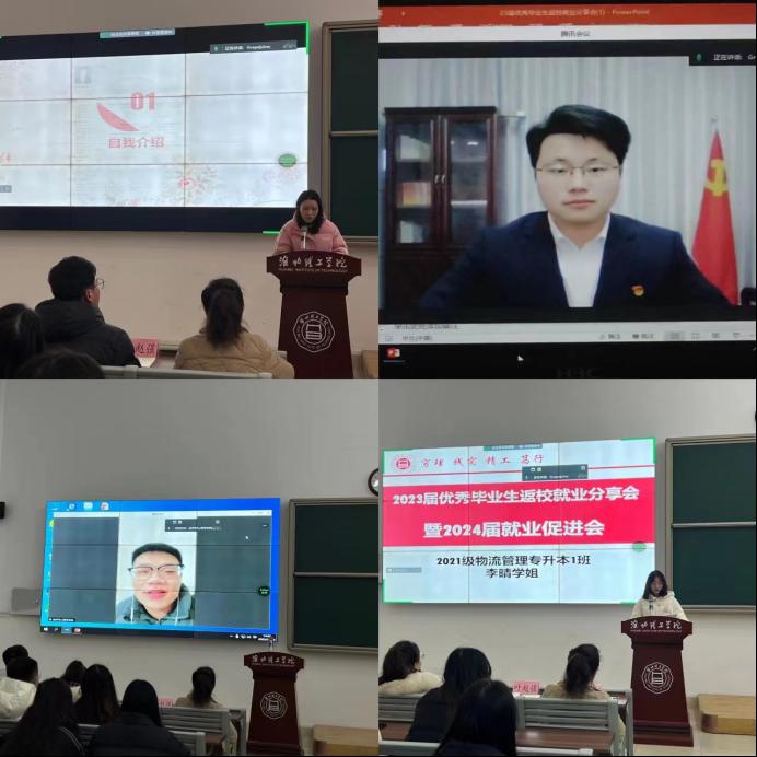 本次活动采用线上与线下相结合的形式进行,邀请了四位2023届优秀毕业生代表进行就业分享,他们分别是就职于国企的2021级人力资源管理专升本1班的刘彤、就职于银行的2021级人力资源管理专升本1班的朱元超、成功考研上岸的2021级物流管理专升本1班的李晴和成功考取公务员的2021级经济学专升本2班的李有航。