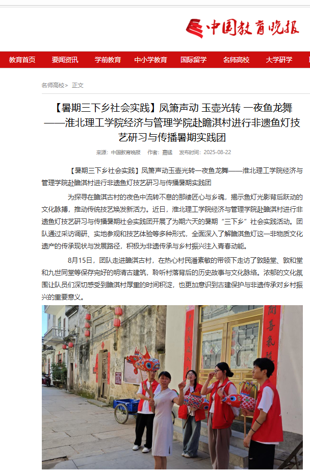 为探寻在瞻淇古村的夜色中流转不息的那缕匠心与乡魂,揭示鱼灯光影背后跃动的文化脉搏,推动传统技艺焕发新活力。近日,淮北理工学院best365手机版官网赴瞻淇村进行非遗鱼灯技艺研习与传播暑期社会实践团开展了为期六天的暑期“三下乡”社会实践活动。团队通过采访调研、实地参观和技艺体验等多种形式,全面深入了解瞻淇鱼灯这一非物质文化遗产的传承现状与发展路径,积极为非遗传承与乡村振兴注入青春动能。对此,中国教育晚报进行了报道: