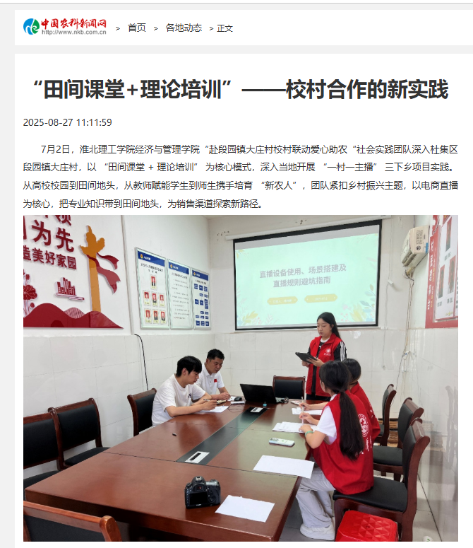 7月2日,淮北理工学院best365手机版官网“赴段园镇大庄村校村联动爱心助农“社会实践团队深入杜集区段园镇大庄村,以“田间课堂 +理论培训”为核心模式,深入当地开展“一村一主播”三下乡项目实践。从高校校园到田间地头,从教师赋能学生到师生携手培育“新农人”,团队紧扣乡村振兴主题,以电商直播为核心,把专业知识带到田间地头,为销售渠道探索新路径。对此,中国农科新闻网进行了报道: