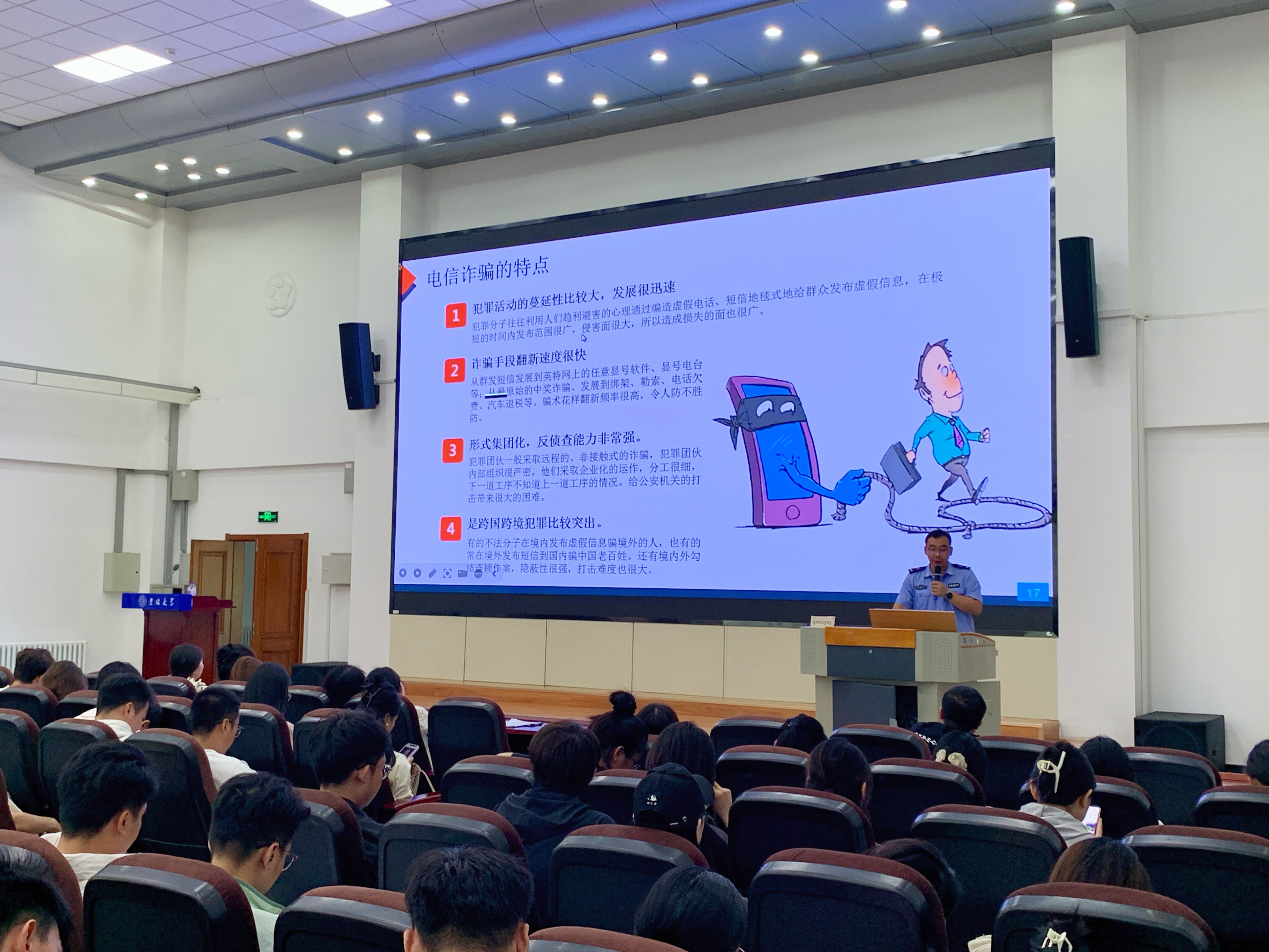 首先,治安科卢阳老师从保护个人财务安全出发,通过剖析近期发生的真实诈骗案例,详细讲解了网络诈骗、电信诈骗等多种新型诈骗手段的特点、危害及防范措施。卢老师建议同学们要提高警惕,不轻易相信陌生人的信息,不随意透露个人信息和银行账户等重要资料。